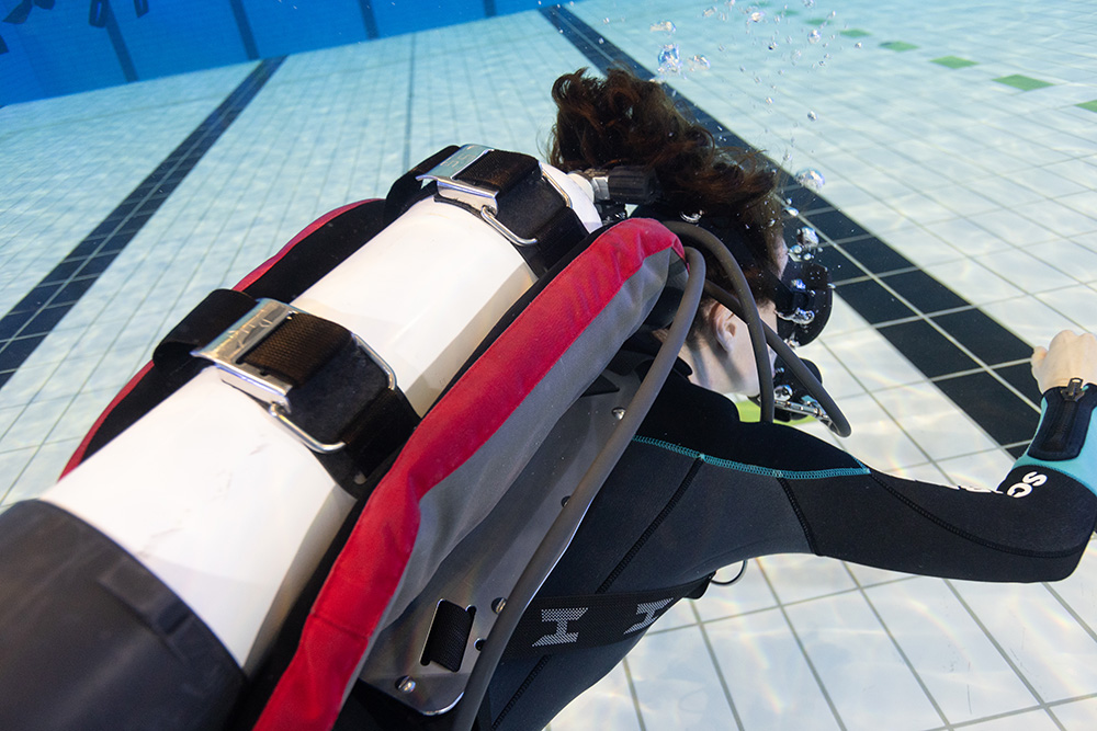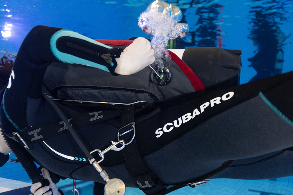 Tip: Leun licht achterover, gebruik eventueel je droogpak als extra drijfmiddel en vul de wing met kleine beetjes. Met de juiste houding word je stabieler aan de oppervlakte dan met een jacket.