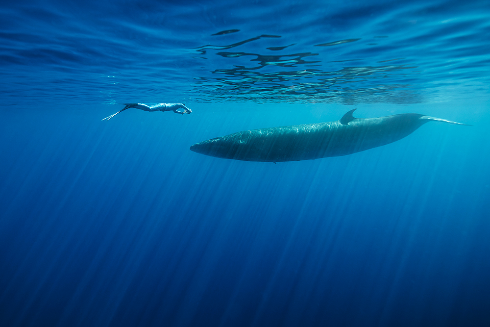“Get ready!!!!” Snel grijpen we onze lange freedivevinnen, zetten maskers op, pakken de camera’s en schuifelen voorzichtig op de rubberen rand van de boot. Michael positioneert de boot zo dat de walvis er het minst last van heeft. Met zijn tweeën zakken we zo rustig mogelijk in het water. Hoe meer we spatten, hoe groter de kans is dat het enorme wezen dat op ons afzwemt versnelt of duikt. Dan komen we er met geen mogelijkheid bij. We zwemmen op onze zij om zo veel mogelijk snelheid te houden en rustig te kunnen naderen. Ik breng mijn ademhaling ondanks de snelheid naar mijn buik. Zo kan ik, indien nodig nog een duik maken. Het silhouet van het machtige dier komt steeds dichterbij. Noordse vinvissen kunnen wel zestien meter lang worden en zijn de op twee na grootste baleinwalvissen. Dus indrukwekkend zijn ze zeker! We zwemmen in de goede lijn.
