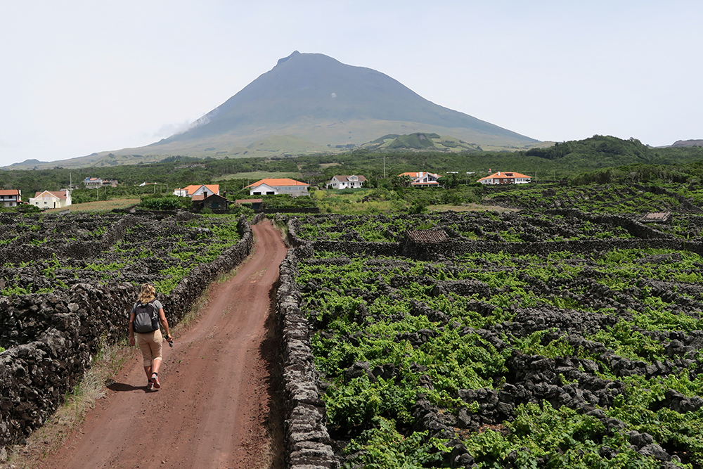 Hierdoor hadden we wel de tijd om het prachtige eiland te ontdekken. Pico is niet een heel groot eiland en ergens voelt het of je een stap terugzet in de tijd. We hebben een leuk appartement in Madalena, aan de westkant van het eiland, met uitzicht op het tegenoverliggende eiland Faial. In de ochtend worden we rustig wakker en drinken een kopje koffie met melk en rekenen daar minder dan een euro per persoon voor af. Vervolgens wandelen we een stuk de berg op naar boven. We genieten van het feit dat we niemand tegenkomen. Van de heerlijke geur en kleuren van de bloeiende hortensia’s en lachen om de weg dravende koeien die op ons reageren alsof we het eerste levende wezen zijn die ze ooit hebben gezien. Waar in Europa kom je dat nog tegen? De daaropvolgende dagen huren we een auto om het eiland te exploreren. We rijden en wandelen langs de wijngaarden met de door lavastenen ommuurde wijnranken. De lavastenen houden de warmte langer vast waardoor de druif een heerlijke zoete smaak krijgt. Een uniek gezicht om de zwarte kleine lavastenen muurtjes te zien met de knalgroene wijnranken met op de achtergrond een brandweerrode molen en de massieve indrukwekkende Pico vulkaan. Het is niet voor niets Unesco werelderfgoed geworden. We kronkelen hoger de berg op en komen letterlijk in de wolken terecht. Wat een uitzicht! Er hangt hier een soort deken van stilte en het heeft iets mysterieus om door de mist de grillig gevormde bomen te zien en spiegelende, sprookjesachtige kratermeertjes te treffen. De enige doorbreking van dit geheel zijn de koeien die uit de flarden opduiken en de stilstaande lucht doorbreken met de trilling van hun koeienbellen. We verlaten het gebied door linksaf te slaan richting São Roque.